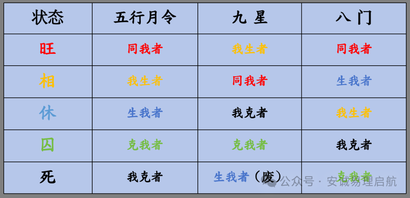 八門反映的是人事維度,對應人盤,主居住者的運勢,與人事關聯密切。八門包括開門、休門、生門、傷門、杜門、景門、死門、驚門等八個門,中宮無門。玄空風水沒有門的概念。奇門八門中,開、休、生為三吉門,傷、驚、死為兇門,杜門、景門為中平之門。八門的旺衰決定了吉凶的程度,吉門旺相代表吉利屬性強,兇門休囚,代表兇性比較弱。關於八門的旺衰,與九星旺衰存在比較大的區別。八門遵循“同我者旺,生我者相,我生者休,我克者囚,克我者死”的法則。九星則遵循“我生者旺,同我者相,我克者休,克我者死,生我者為廢”的法則。